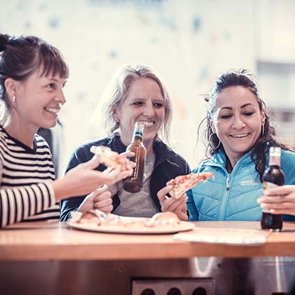 Du brauchst eine Pause oder willst nach dem Klettern noch gemütlich etwas trinken? An unserer Bar im Zentrum der Halle gibt es diverse warme und kalte Getränke. Für den Hunger danach bieten wir verschiedene ofenfrische Pizzen oder Flammkuchen.