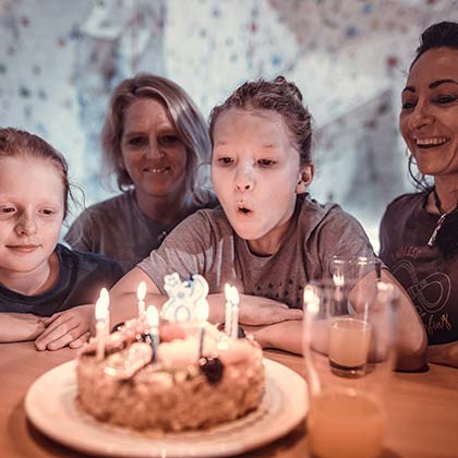 Zu Beginn wärmen sich die Kinder im Boulderraum mit einem Boulderspiel auf. Danach werden die Klettergurte angelegt und die Kinder werden von einem Trainer gesichert. Nach der Hälfte machen wir eine kurze Pause, in unserem Geburtstagsraum gibt es einen Teller mit Muffins und ein Getränk für jedes Kind. Danach wird wieder geklettert.
